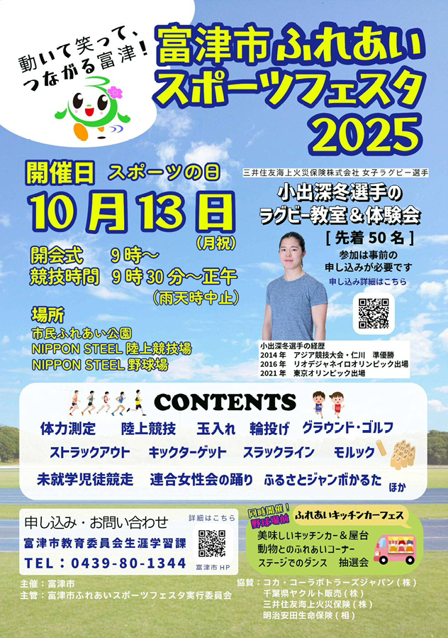 10月13日(祝・月)富津市ふれあい公園 NIPPON STELL 陸上競技場・野球場にて「富津市ふれあいスポーツフェスタ 2025」が開催され、昨年に引き続き商品協賛と健康教室を実施しました。
